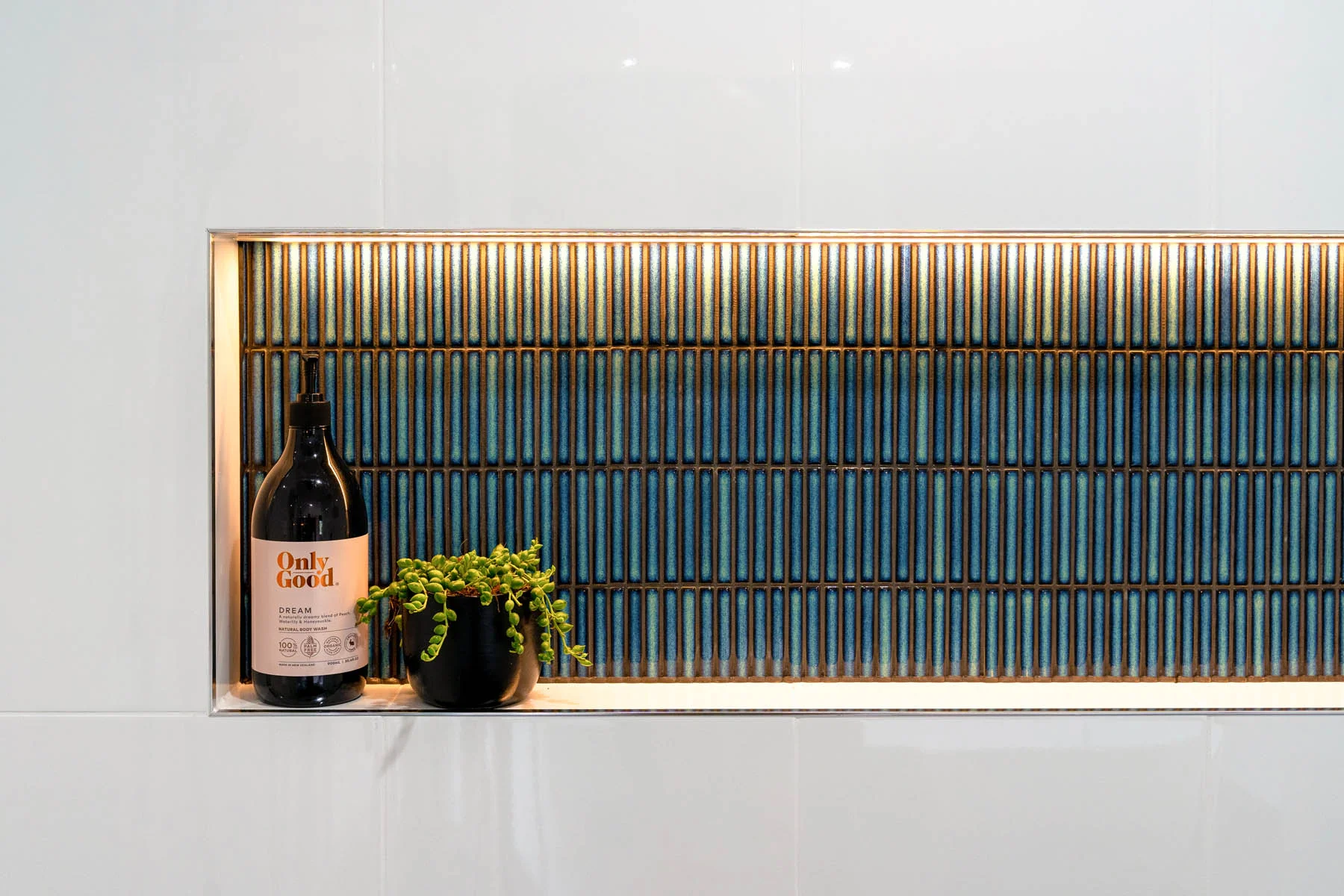 An in-wall niche provides a neat and tidy space for shampoos and soaps, keeping the area clutter-free and streamlined.